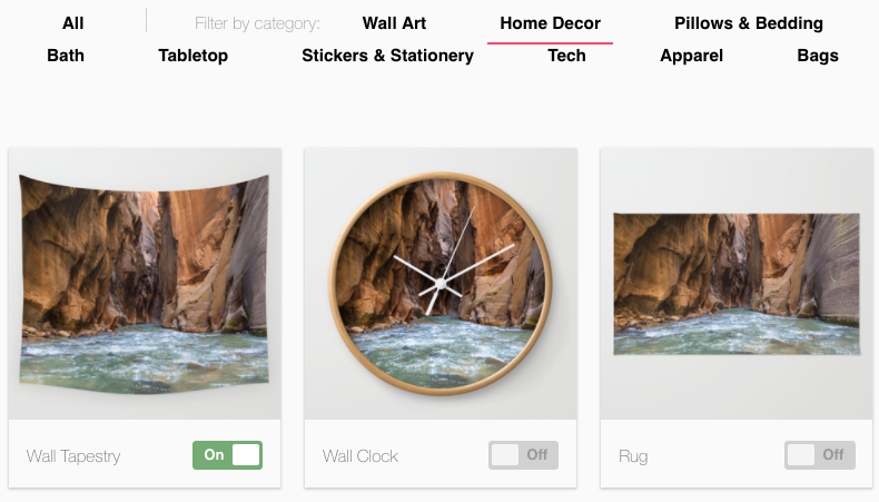 Once the artwork has been selected and uploaded, there will be a selection process where the artist chooses where the art will be sold. It gets applied to the most products possible (for example wall tapestries, clocks, rugs or mugs) but the user can choose from it. Leaving them ON means approved.