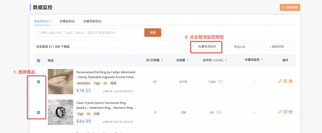 首先选中您需要取消监控的商品,然后点击右上方的“批量取消监控”按钮即可取消监控。
