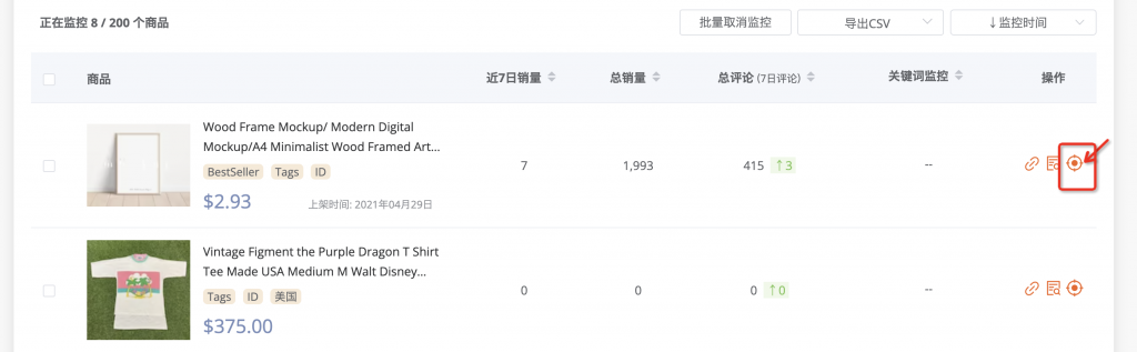 点击“操作”下的“监控”按钮,即可查看商品的监控详情。