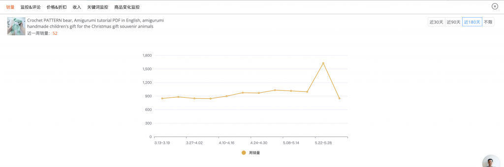 请注意,自您开始监控此商品之日起,我们将仅展示过去三个月内的该商品周销量数据,但之后会每周记录一次该商品的周销量数据,以帮助您更好地了解其销售趋势和表现。