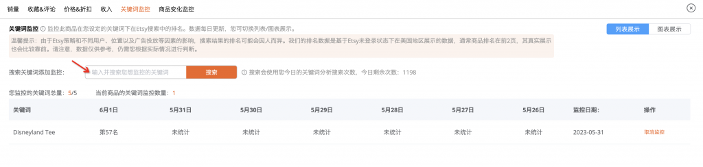 通过此功能,您可以监控商品在您设定的关键词下的Etsy排名,数据每日更新。您可以选择列表或图表的展示方式。