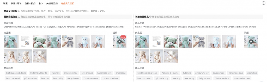 如果您想了解商品标题、描述和标签等详情是否有变化,可以使用此功能。从您开始监控商品的当天起,系统将保存当天的商品信息,并每天进行监控。如有最新变动,我们将进行标识。