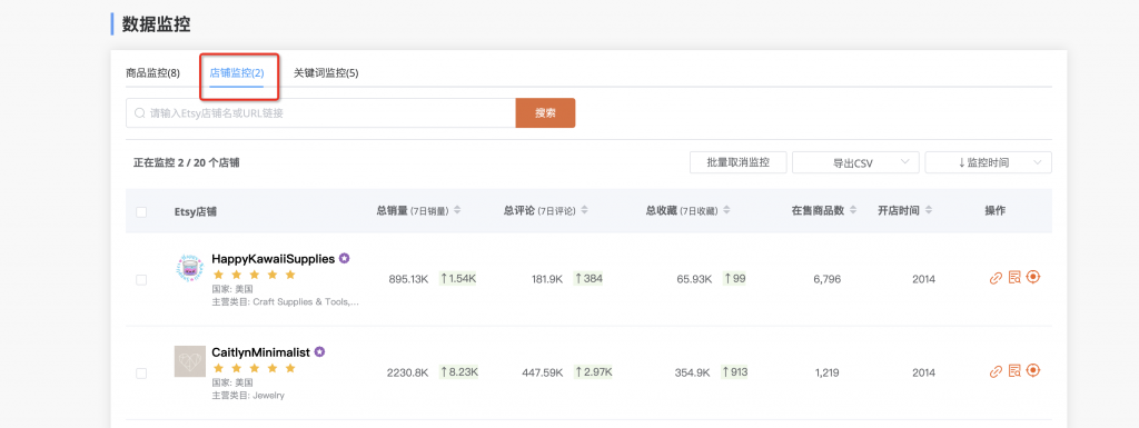 点击“操作”下的监控按钮,即可查看店铺监控详情。