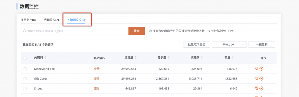 - 关键词监控:监控关键词下Etsy商品的排名,每天呈现最新的排名情况。提供竞争度、销量、均价等数据,深度洞察市场趋势。