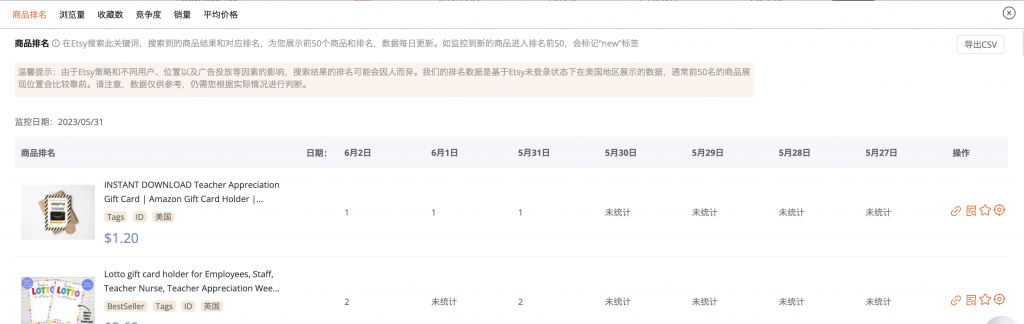 在Etsy搜索此关键词时,搜索到的商品结果和商品对应的排名位置。为您展示近一周的前50个商品和排名,数据每日更新。如果监控到新的商品进入排名前50,则会标记“new”标签。
