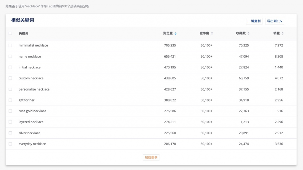 我们在实际运营过程中,常常会苦于寻找竞品长尾词、核心词去优化Listing,“相似关键词“为您省去了头部商品对比,海量找词的环节。同时还支持一键复制与导出,让您在后台替换关键词更方便。在寻常长尾词的过程中,理想的是找到搜索量高、竞争度低、销量高的关键词,而实际上可以牺牲一定的搜索效果,去拿下搜索量一般,但高转化(高销量)的词。