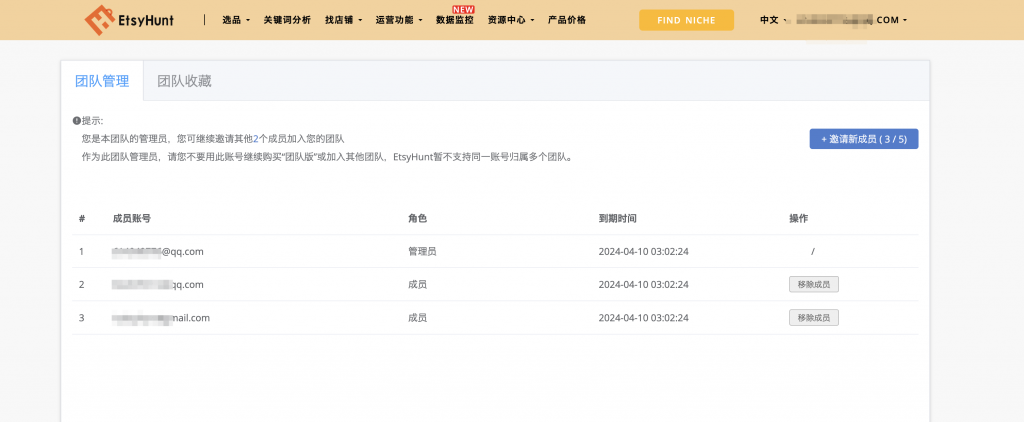 团队版可以为您的团队带来更多协作和管理的便利。EHunt团队版是在个人套餐Pro版的基础上进一步发展而来,融合了EHunt所有的高级功能。其最大的特点就是团队管理的统一性,您的团队管理员可以随时在【我的团队-团队管理】中邀请或移除团队成员,方便进行团队管理。