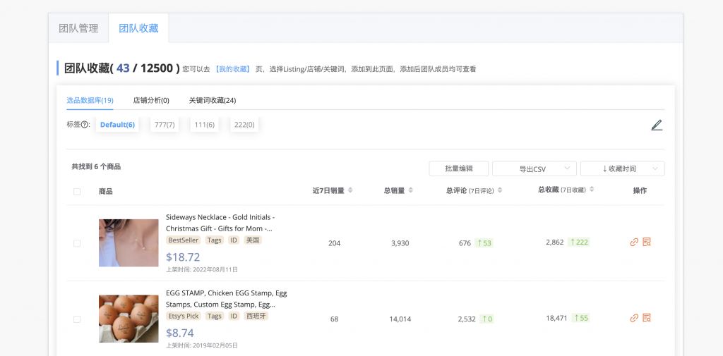 团队版不仅有以上两项独特能力,还在权限分配上具备显著优势。除了享受“选品搜索”、“店铺搜索”、“店铺分析”、“亚马逊手工品选品”、“下架商品选品”、“EtsyGPT“等功能的无限制使用,团队成员还可以共享每日1200次的“关键词分析”功能权限,以满足不同成员对权限的不同需求。此外,团队版套餐独有的“团队收藏”功能,让整个团队可以共享最多12500个商品或店铺。