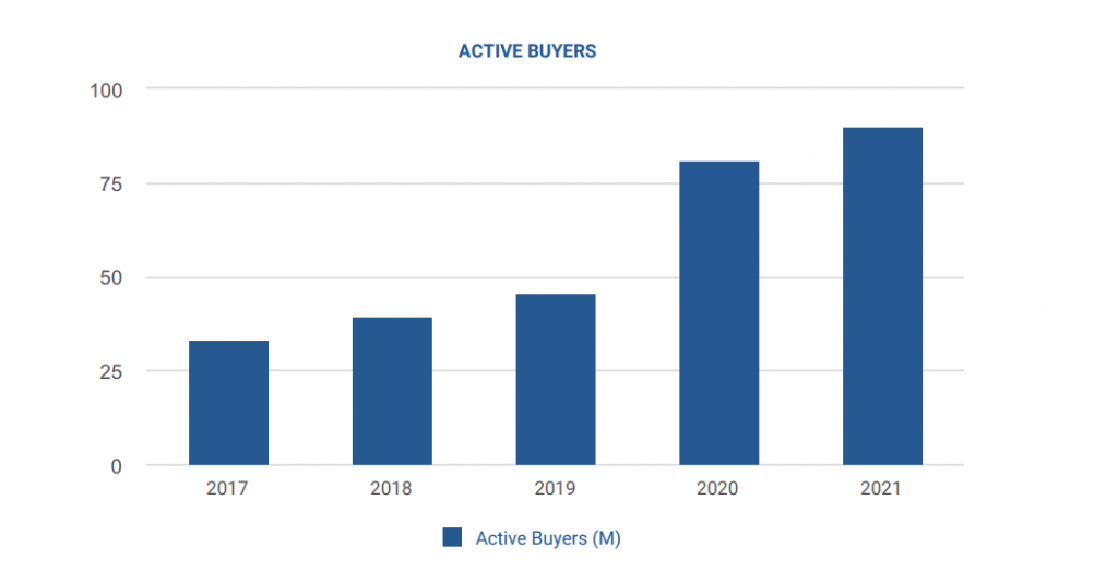 - 活跃用户总数超过9000万,较2020年新增近 3500 万买家。