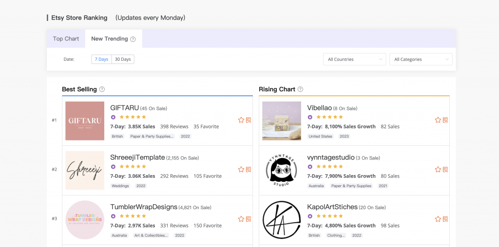 EHunt offers powerful features to help you unlock growth opportunities on the platform. Discover top Etsy sellers and identify hot-selling items to gain inspiration and insights for your own Etsy business. Stay updated on what is most searched on Etsy and what's trending on Etsy to align your offerings with customer demand. Utilize the Etsy keyword tool to optimize your Etsy shop name, improve your Etsy SEO, and maximize your Etsy profit.