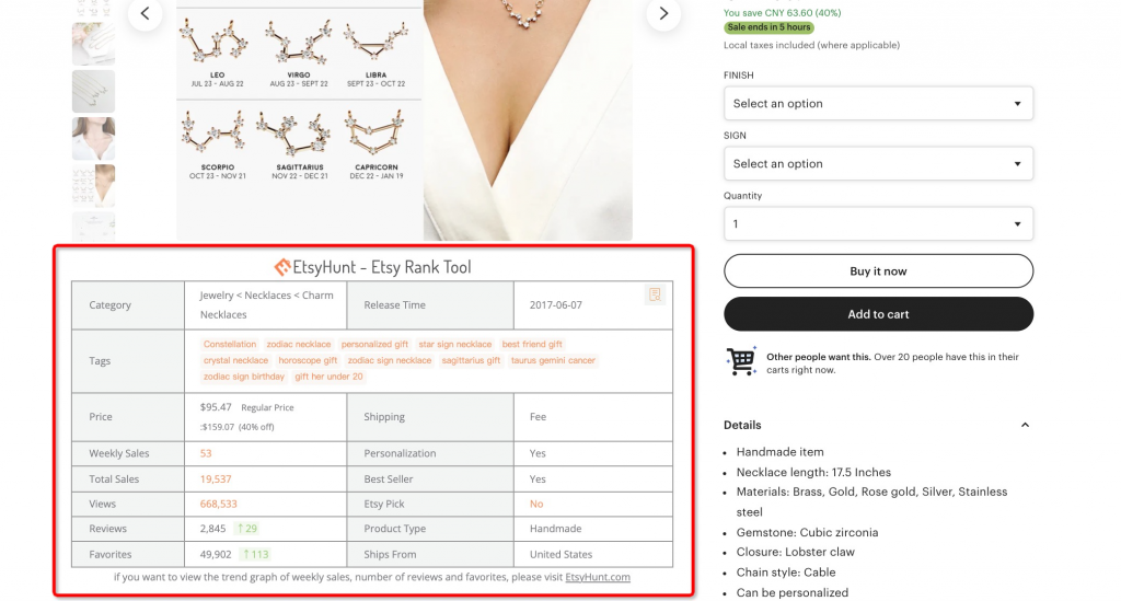 - Total sales, weekly sales, total views, total reviews, weekly reviews, total favorites, weekly favorites