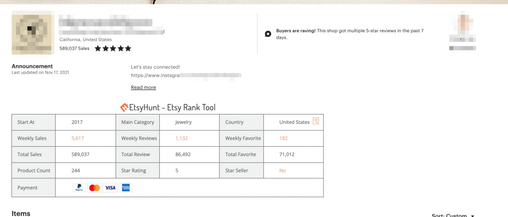 - Number of items for sale, shop rating, whether you are a star seller, and payment methods supported