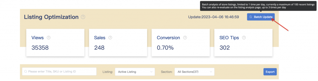 Please note that "Batch Update" is available once a day and can assess up to 500 of your shop's recent listings. The evaluation process takes about 3 minutes, so please be patient.