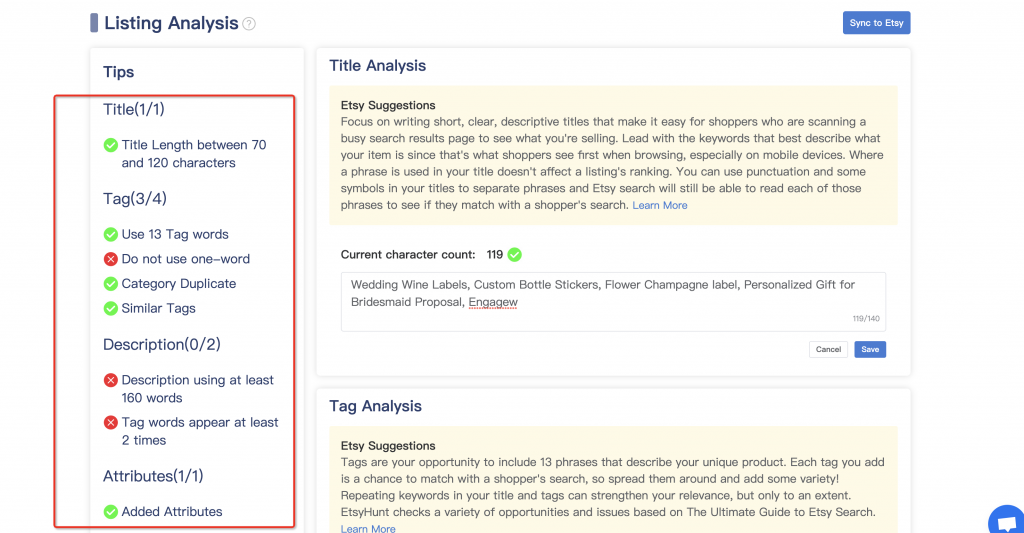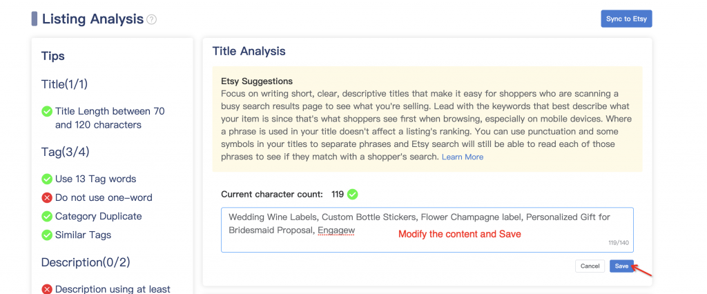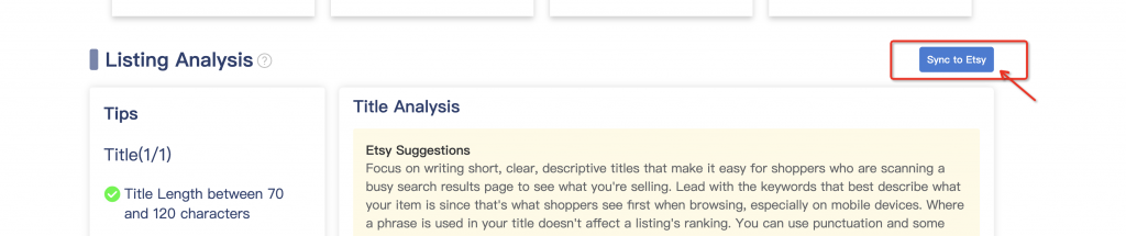 3. Sync to Etsy: After making modifications to titles, descriptions, keywords, etc., click the "Sync to Etsy" button. This action syncs the changes made within the EHunt system to your Etsy shop, completing the actual modification and synchronization. Each listing supports up to 3 syncs per day.
