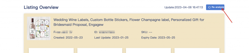 4. Re-analysis: After making changes and syncing to Etsy, click "Re-analysis" to view the latest feedback on the listing evaluation.