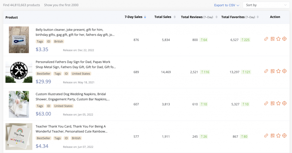 - Advanced Filters: Refine results based on product shipping location, type, total favorites within the last 7 days, and review changes.